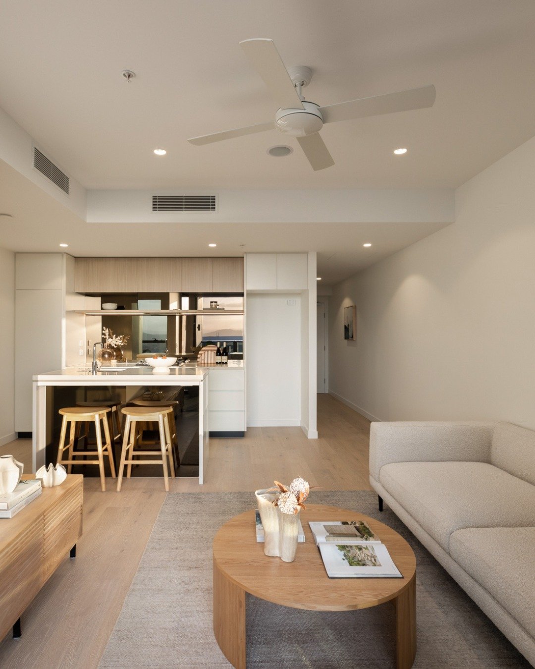 Finish the setup with one color-block textile or a strong stone pattern to prevent the gentle palette from feeling flat. When extra dining seats are needed, keep two stackable chairs beside the media console so they can slide to the table quickly. A compact bar cart near the peninsula makes hosting easier without disturbing the layout. These small moves keep the modern idea warm, workable, and grounded.