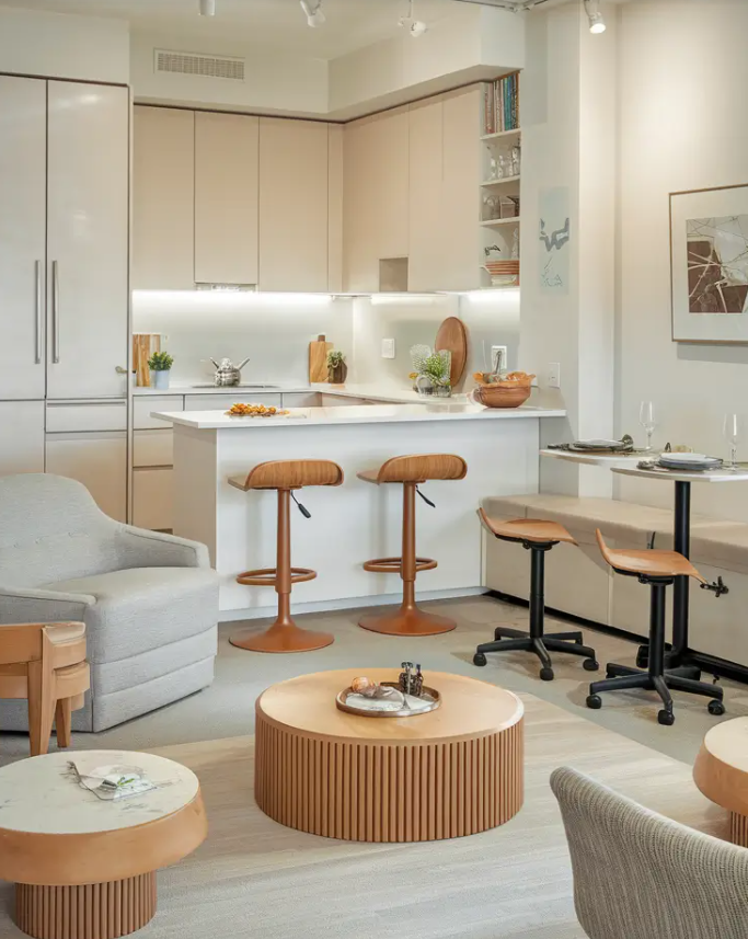Nesting coffee tables, wall-mounted shelves, and armless lounge chairs help conserve space and expand options. Counter stools with footrests and slim backs slide neatly under the counter, preserving a calm visual field in the open kitchen living room layout. A loveseat-length couch with a storage ottoman brings comfort and hidden capacity. A shallow bench on the dining side replaces extra chairs and cuts down depth in the dining room floor plan.