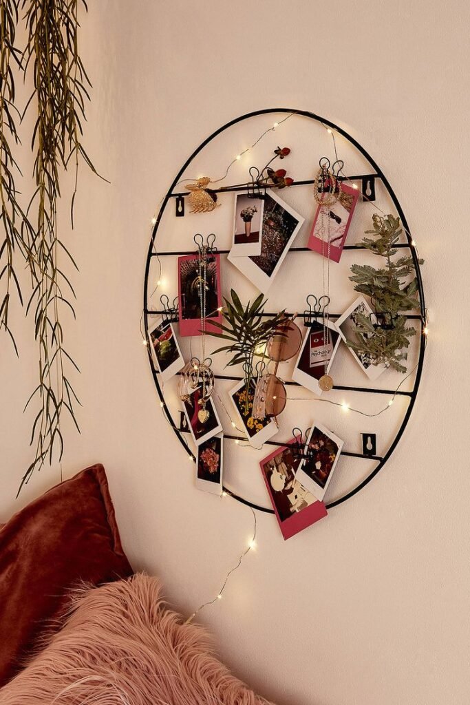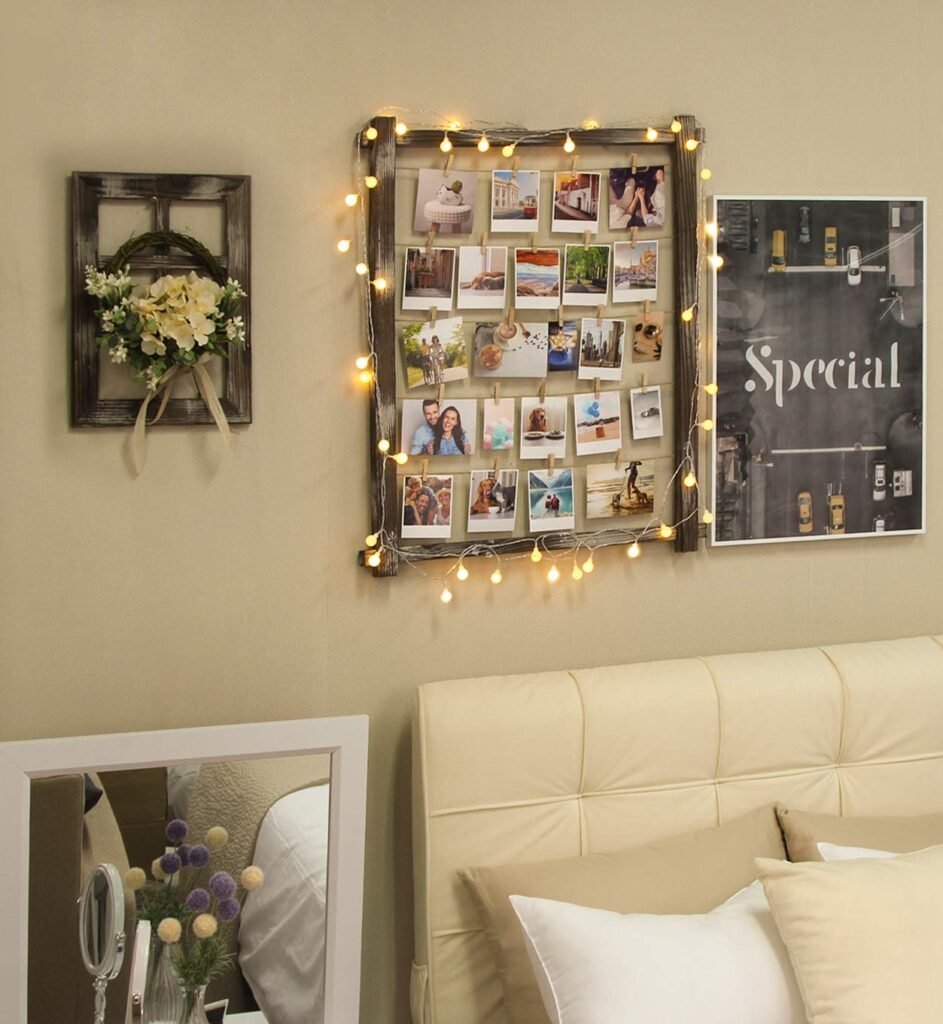 A string of photos clipped with wooden pegs creates a warm and rustic look. It feels casual and flexible, perfect for cozy corners.