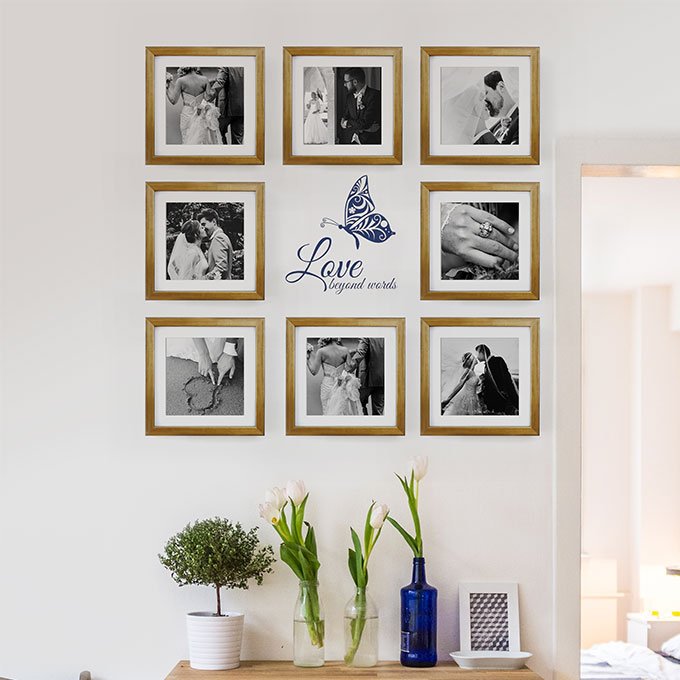 Example: A wedding photo in the center, surrounded by engagement, honeymoon, and family shots.