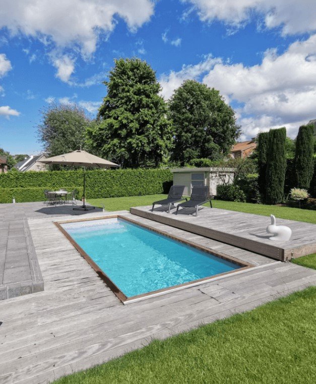 An above-ground pool saves on digging and fits easily into tight yards. Add wooden decking around it, and it looks built-in. Decking also offers a safe space for chairs, loungers, or even a fire pit.