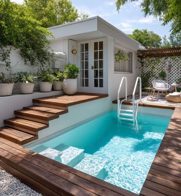 Multi-purpose design is key for small yards. A pool with built-in benches and steps saves space while keeping comfort in mind.