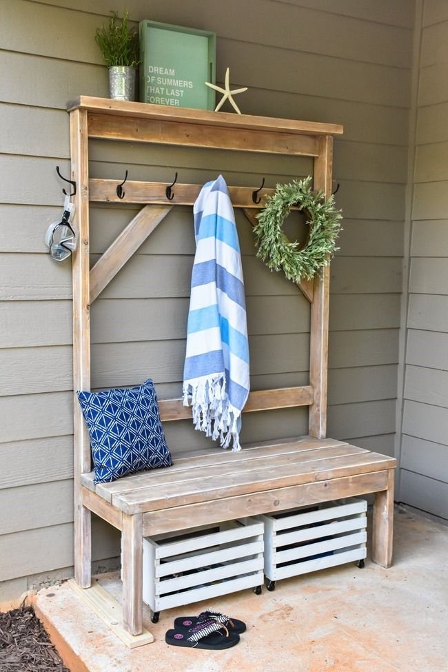 A poolside bench with a built-in towel rack is double-purpose. People sit and remove wet swimwear. Bars or hooks underneath the bench hold towels.