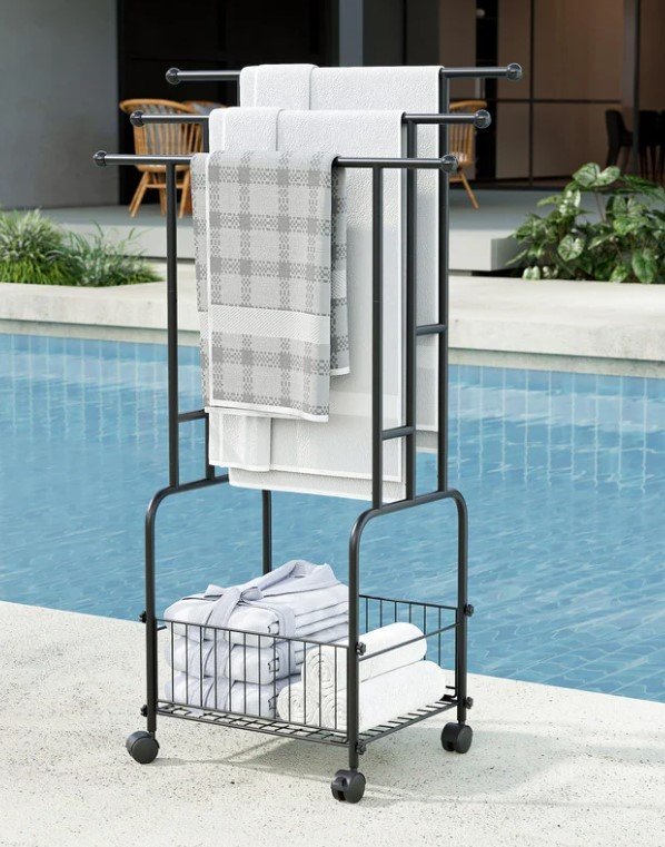 A mobile towel rack moves to any spot around the pool. This design is useful for parties or cleaning. Metal or plastic racks with wheels handle wet towels easily.