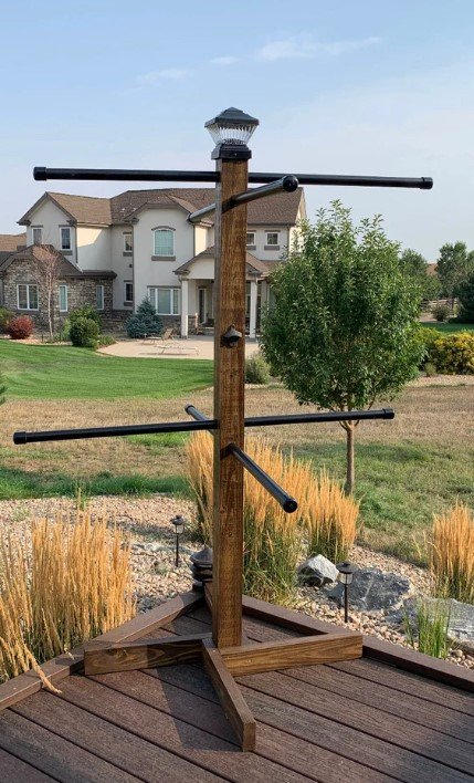 Some racks have multiple ropes for extra capacity. The look is simple, airy, and natural. This idea suits outdoor spaces where style is casual and relaxed.