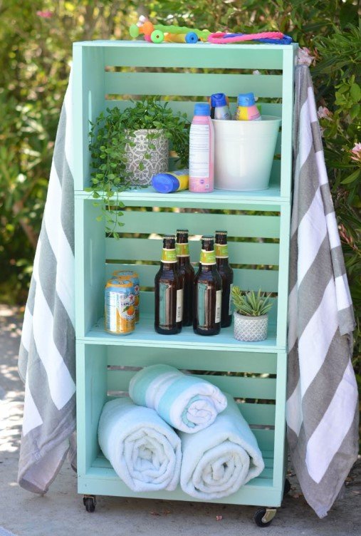 This option is both practical and decorative. It fits small or large spaces depending on size. A ladder also creates vertical storage, saving floor space near the pool.