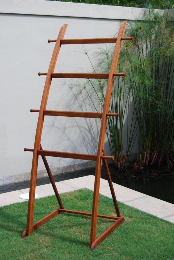 Wood gives a natural look. Teak and cedar are ideal choices because they resist water damage. A freestanding wooden rack can stand anywhere near the pool.