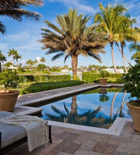A pool surrounded by tropical design elements creates a space that feels like a getaway without leaving home. Palm trees add height, hibiscus brings color, and bamboo offers privacy.