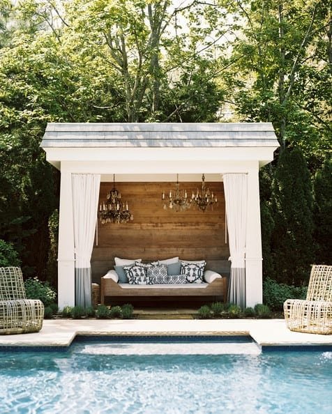 A cabana or gazebo provides shade and a social spot by the pool. Made of wood, bamboo, or thatch, it instantly gives a tropical resort look. Add curtains for privacy and soft cushions for comfort.