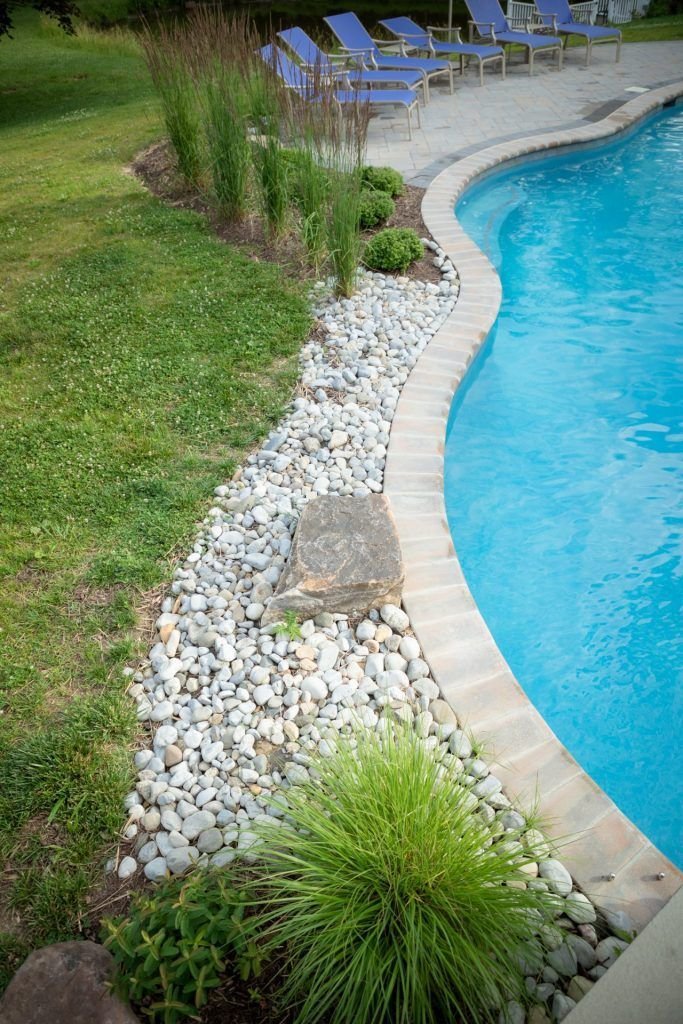 Rocks and pebbles add texture to the garden and help control soil erosion around the pool. Large stones can be placed near plants for a natural landscape look. White pebbles or river rocks create contrast with green foliage.