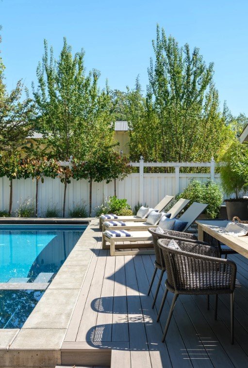 Furniture plays a big role in a tropical pool design. Wood, wicker, and rattan materials work best for this style. A few lounge chairs with soft cushions invite relaxation under the sun. Adding a daybed or hanging chair creates a cozy, vacation-like spot.