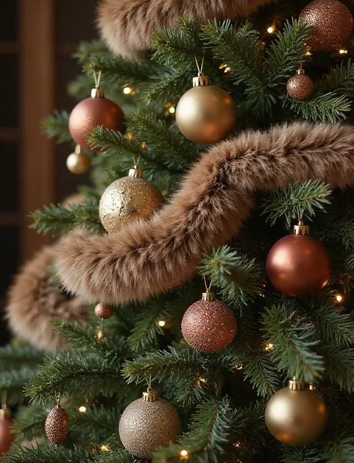 - Material mix: pair fur with silver, gold, or glass ornaments to reflect light and add sparkle.