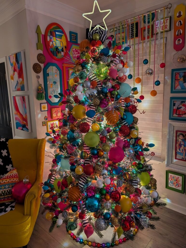 The finished tree feels like pure celebration—spirited, bright, and full of imagination that lifts every corner of your home.