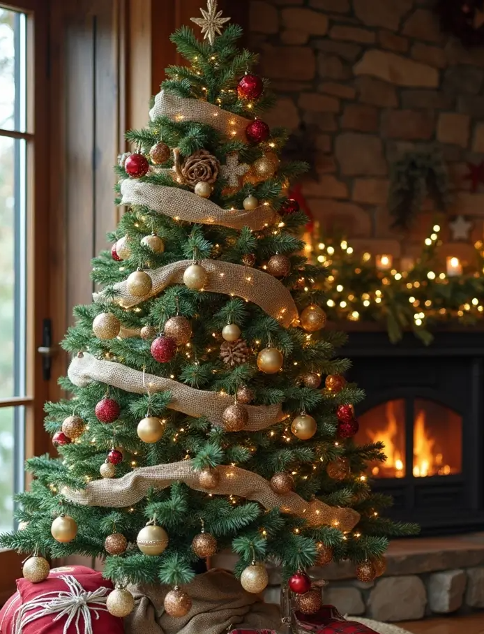 Rustic Cabin Retreat transforms your tree into a cozy hideaway filled with warmth and texture. Think natural fibers, handcrafted accents, and soft, glowing lights that echo a mountain cabin glow. Begin with earthy tones—rich browns, cream, and muted red—for a calm, fireside charm.