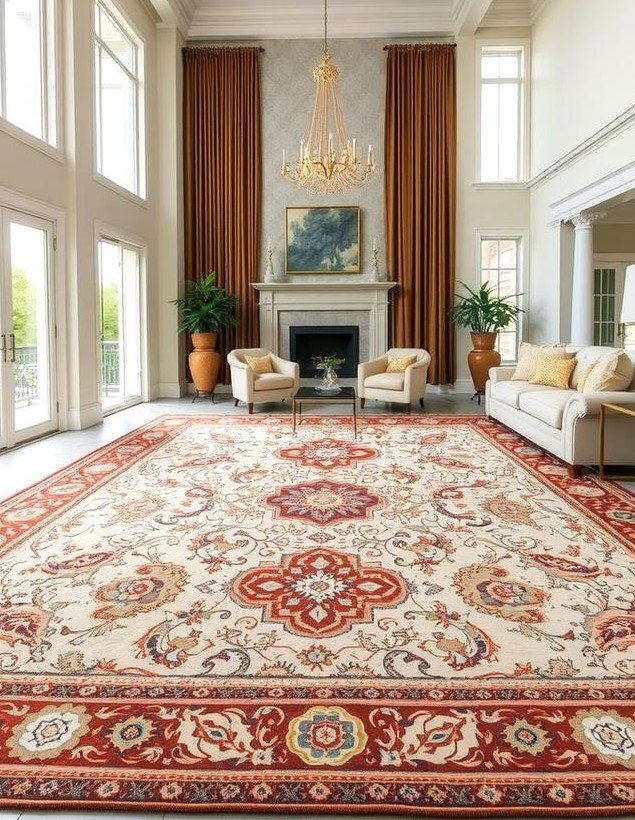 An oversized rug grounds a Ralph Lauren–inspired living room with refined comfort and structure. Select detailed Persian patterns for a touch of artistry or neutral hues for subtle harmony. Extending the rug beneath key furniture creates visual unity while adding warmth and softness underfoot. This approach gives the space balance, texture, and an elevated sense of polish—an effortless statement of classic sophistication.