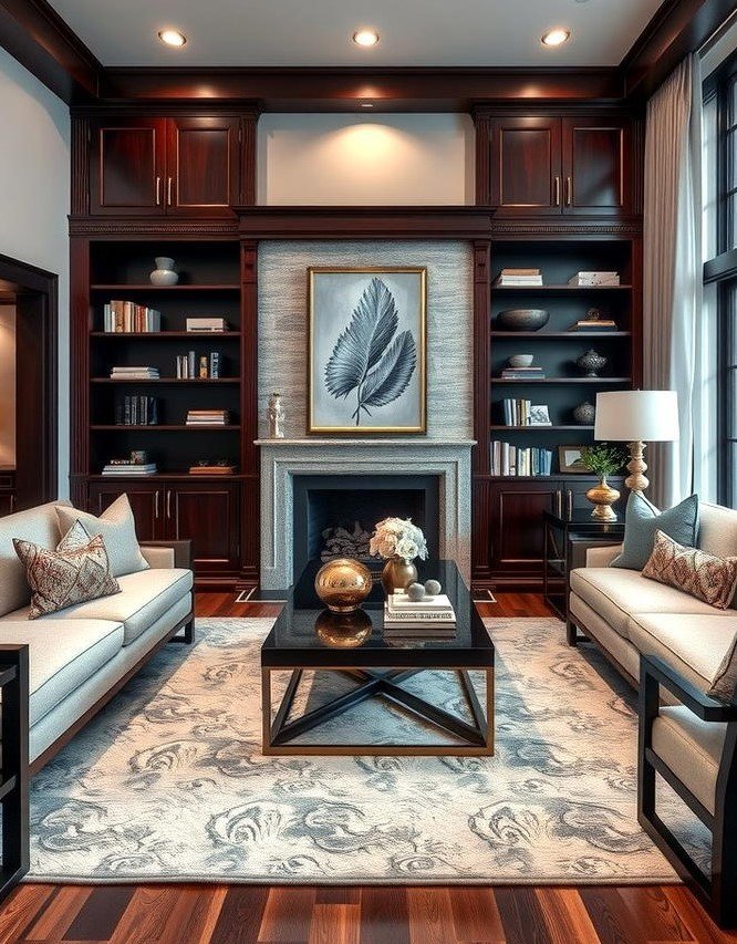 Dark wood furniture like mahogany or walnut brings lasting elegance and character to any living room. Rich finishes lend depth and sophistication, while lighter fabrics or metallic touches balance the mood. Try a polished coffee table, bookshelf, or sideboard as the room’s focal point. This combination highlights craftsmanship and creates a warm, elevated atmosphere with timeless appeal.