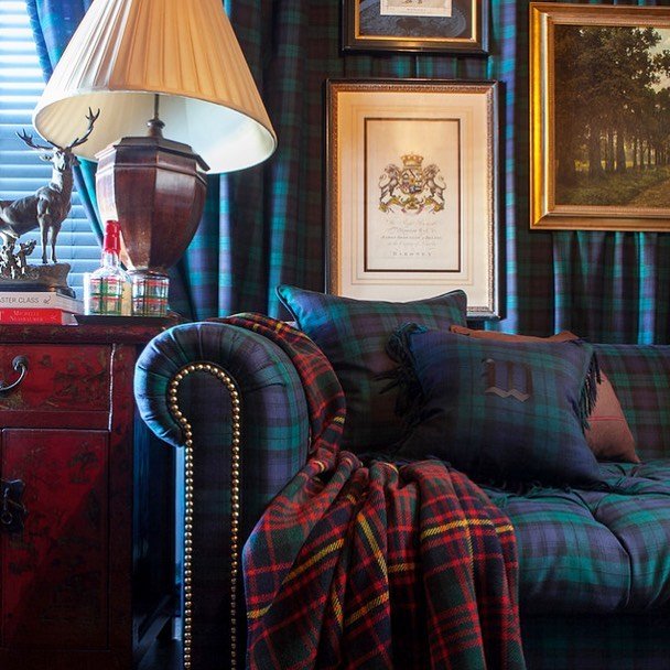Plaid textiles introduce warmth, charm, and subtle texture to Ralph Lauren–inspired interiors. Add plaid throws, pillows, or upholstered chairs to craft a space that feels both comfortable and refined. Deep red, forest green, and navy tones pair beautifully with leather and dark wood, creating an inviting mix of richness and comfort. Perfect for rustic or classic spaces, plaid brings timeless familiarity and understated sophistication.