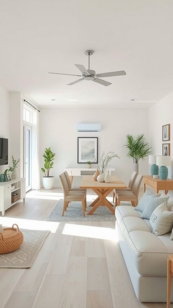 Large windows flood the room with natural light, highlighting the gentle tones of the decor. Simple green plants peek out, bringing a breath of fresh air indoors, while the overall arrangement creates a stunning and simple farmhouse aesthetic.