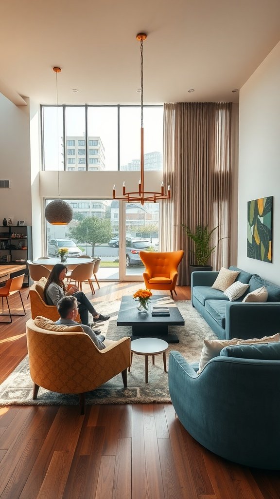 In farmhouse design, statement beams can really steal the show. They add a rustic touch that brings warmth and character to any living room. The image showcases an inviting space with high ceilings and beautiful wooden beams that draw the eye upward.