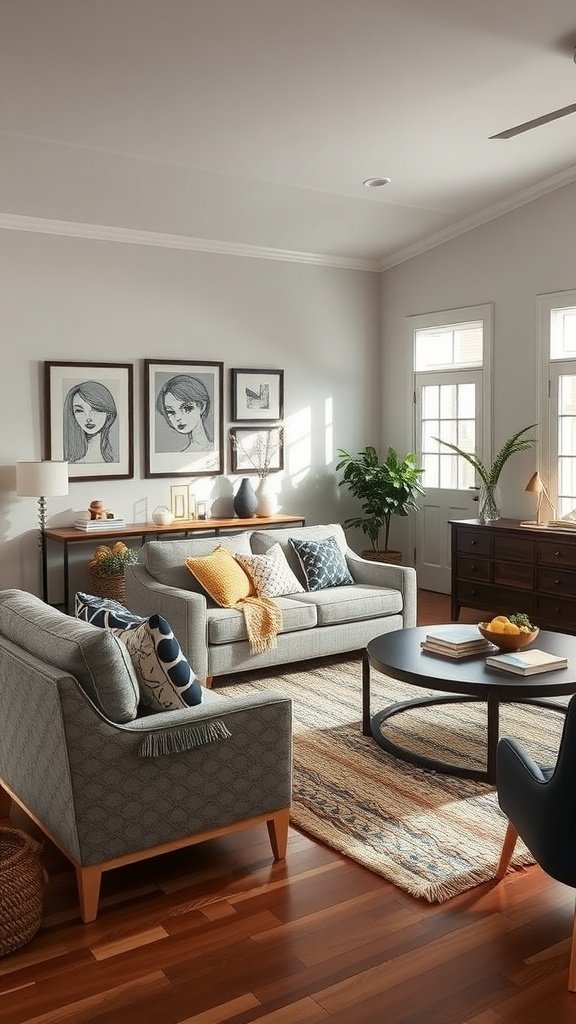 The living room captures the essence of family treasures beautifully. The arrangement is warm and inviting, showcasing various framed photographs that tell stories of loved ones and memorable moments. This decor style embraces nostalgia, making it a perfect fit for stunning & simple farmhouse living room decor ideas.