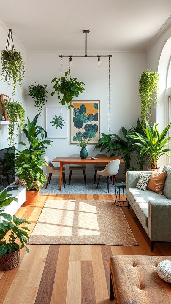 Adding greenery to your living room instantly brings life and freshness to the space. The image above showcases a beautiful farmhouse living room filled with various plants, from hanging ferns to potted succulents. Each plant adds a unique touch, creating a warm and inviting atmosphere.