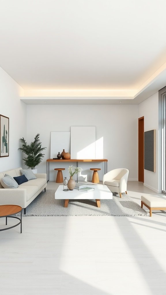 The centerpiece is a beautiful wooden coffee table that balances the light tones of the room with its rich color. A simple round tray holds books and a small plant, keeping the look clean and inviting.