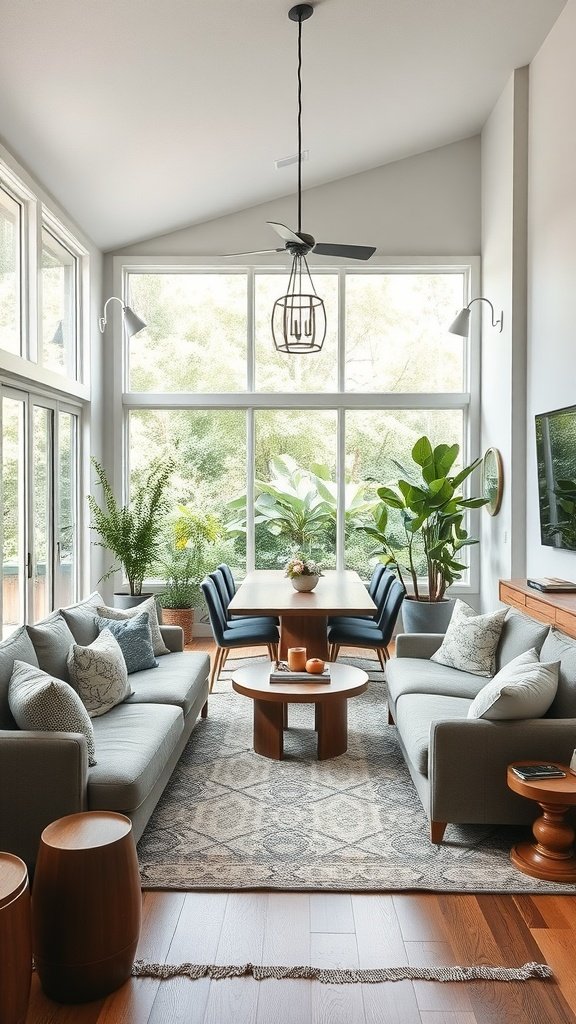 The natural light streaming through large windows enhances the open feel, inviting you to enjoy the view outside. The furniture layout encourages conversation, making it a friendly space for gatherings. With its stunning and simple design, this Bohemian farmhouse living room truly embodies the charm of farmhouse decor.