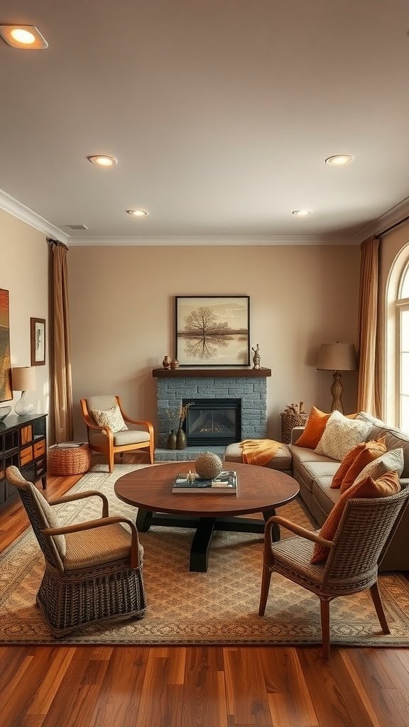 Imagine stepping into a living room filled with warmth and comfort. This cozy space features a soft, light-colored sofa adorned with fluffy throw pillows. The pillows add a touch of luxury and inviting texture to the room, making everyone feel at home.