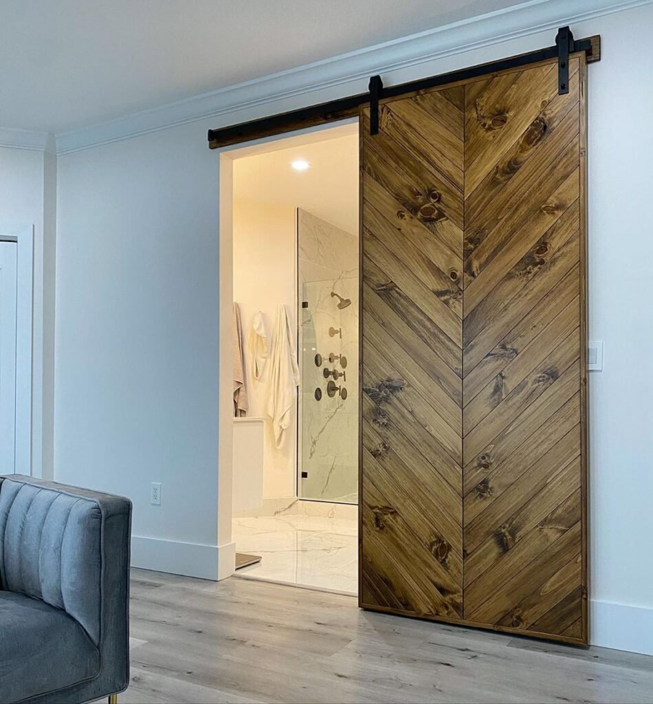 Chevron-pattern barn doors bring a sense of art and craftsmanship. The angled “V” design draws attention and creates depth. It’s an eye-catching feature that instantly lifts the look of any room.