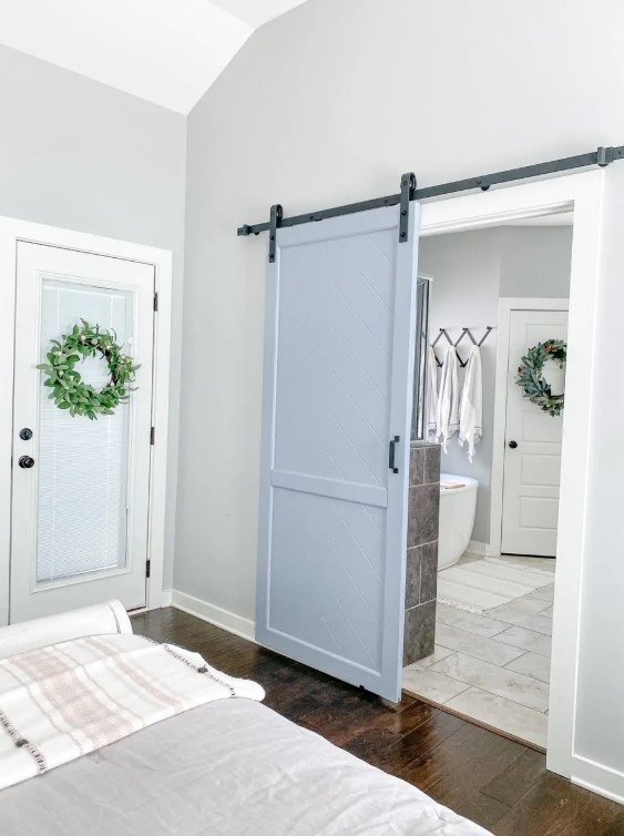 A barn door in the bathroom saves space and adds character. It slides neatly without taking up extra room, making it perfect for tight areas.