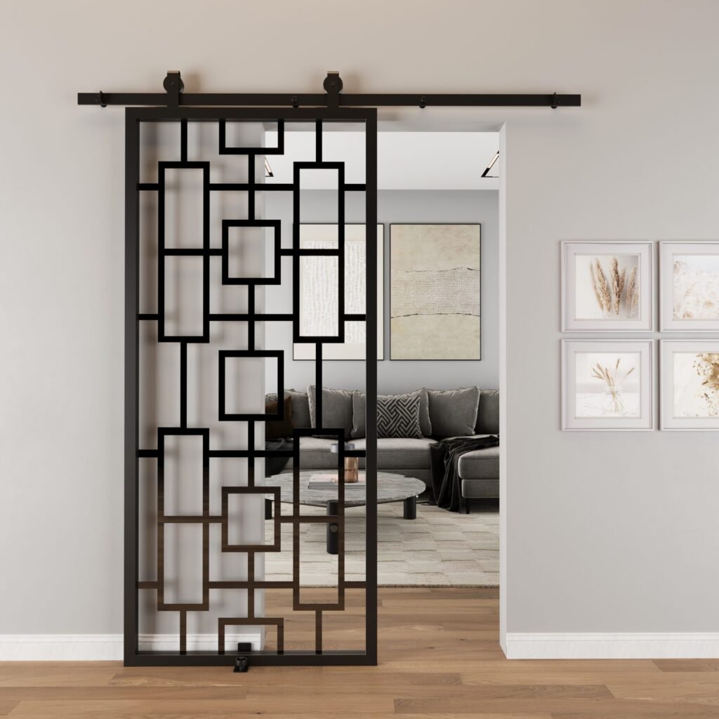 This type of barn door looks stunning in hallways, offices, or living rooms. Against white, gray, or wooden walls, it adds depth and modern charm. You can also install it as a sliding divider between a bedroom and bathroom.