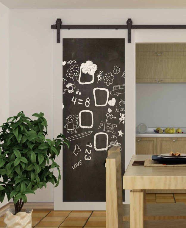 A chalkboard barn door adds creativity and fun to your space. It’s especially useful in kitchens, playrooms, or home offices. The chalkboard surface lets you write notes, grocery lists, reminders, or even draw doodles.