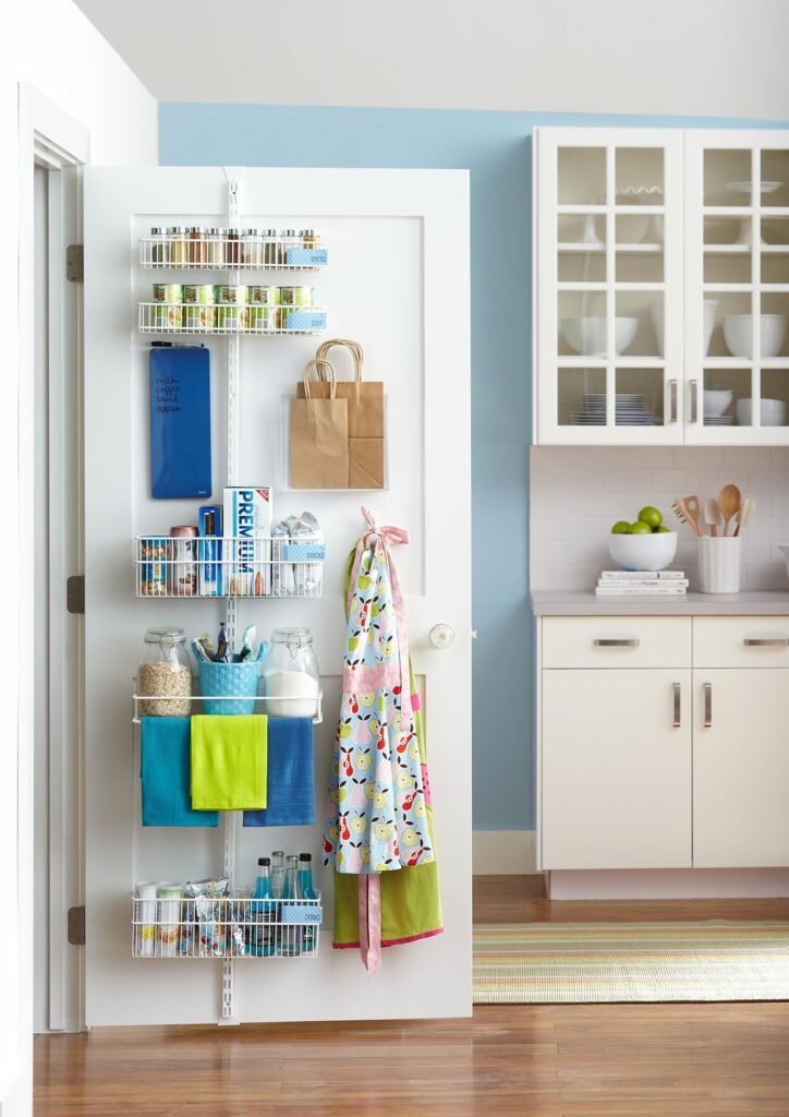 In the kitchen, hang a spice rack or cleaning supplies behind cabinet doors. Even small racks or baskets can make a big difference. This trick keeps things out of sight while staying easy to reach.