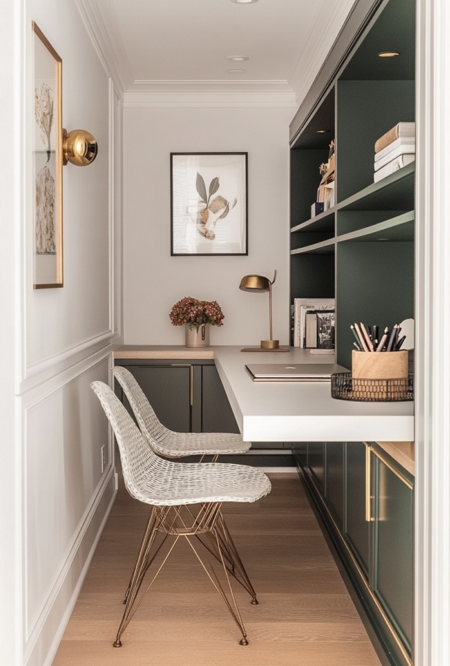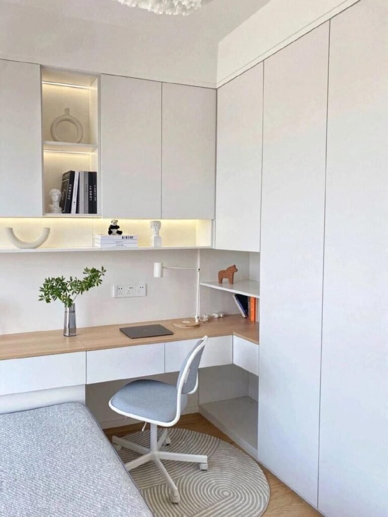 Create a sleek workspace with a narrow built-in desk wall—perfect for compact rooms and smart design lovers. This setup saves space while offering a polished, modern look. Add open shelving, subtle textures, and soft lighting to keep the area airy yet practical. Great for home offices or study corners—simple structure, big impact.
