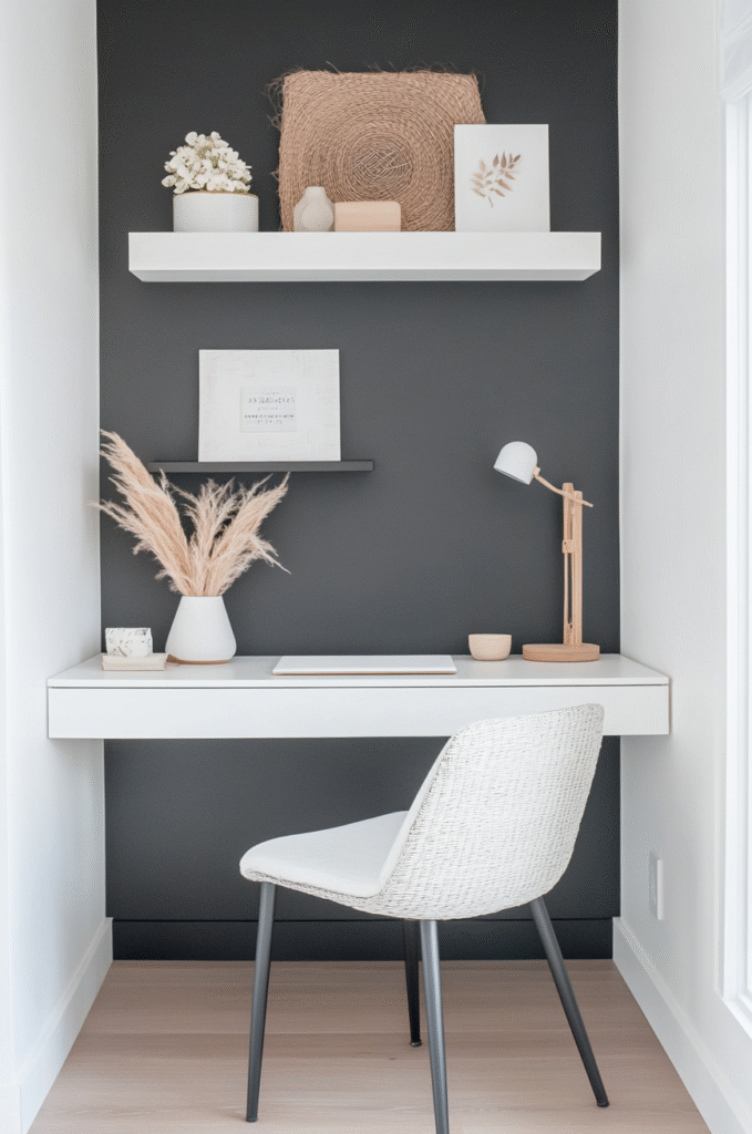 Transform a small corner into a sleek workspace with a floating desk nook. Perfect for modern homes, this clean setup blends function and calm style. Add warm lighting, subtle decor, and hidden storage for a clutter-free look. Ideal for remote work or study moments—simplicity never felt so inspiring.