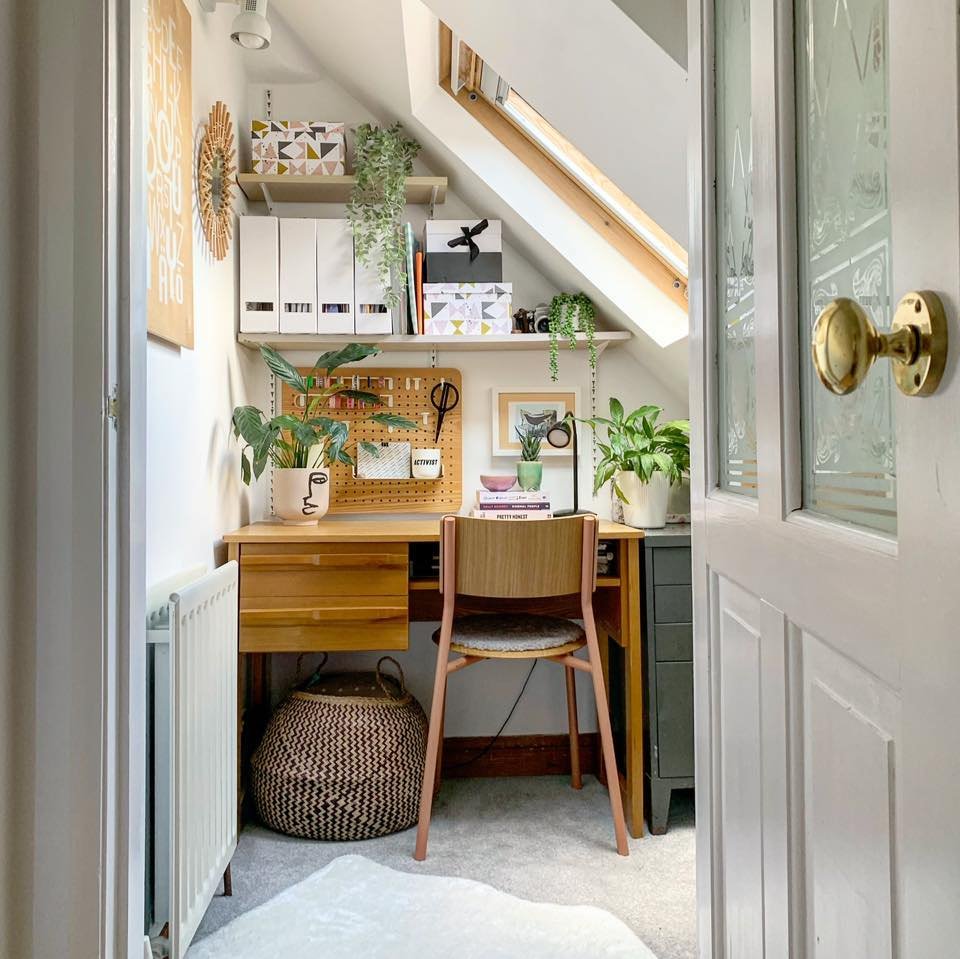 Turn an awkward corner into a creative hub with an eclectic office under a slanted ceiling that mixes color, texture, and character. Combine vintage pieces with modern accents to make the most of your angled space. Use low shelving, bold art, and layered lighting to add depth without crowding the area. This setup turns a tricky nook into a workspace full of personality and charm.