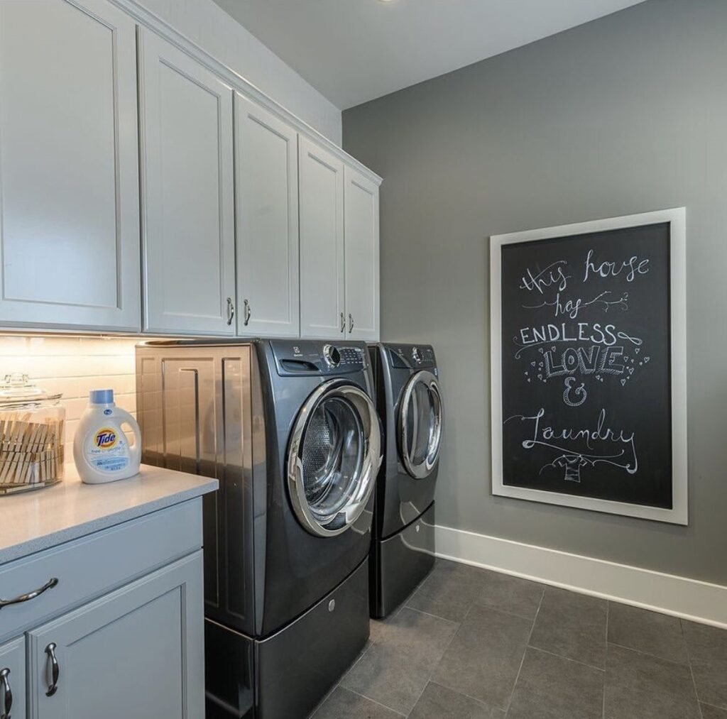 Add a chalkboard or whiteboard to your laundry area for jotting reminders, stain tips, or family notes. This practical wall feature keeps instructions visible and makes everyday tasks easier to manage. A simple solution that combines organization with a personal touch, helping you keep routines clear and spaces functional.