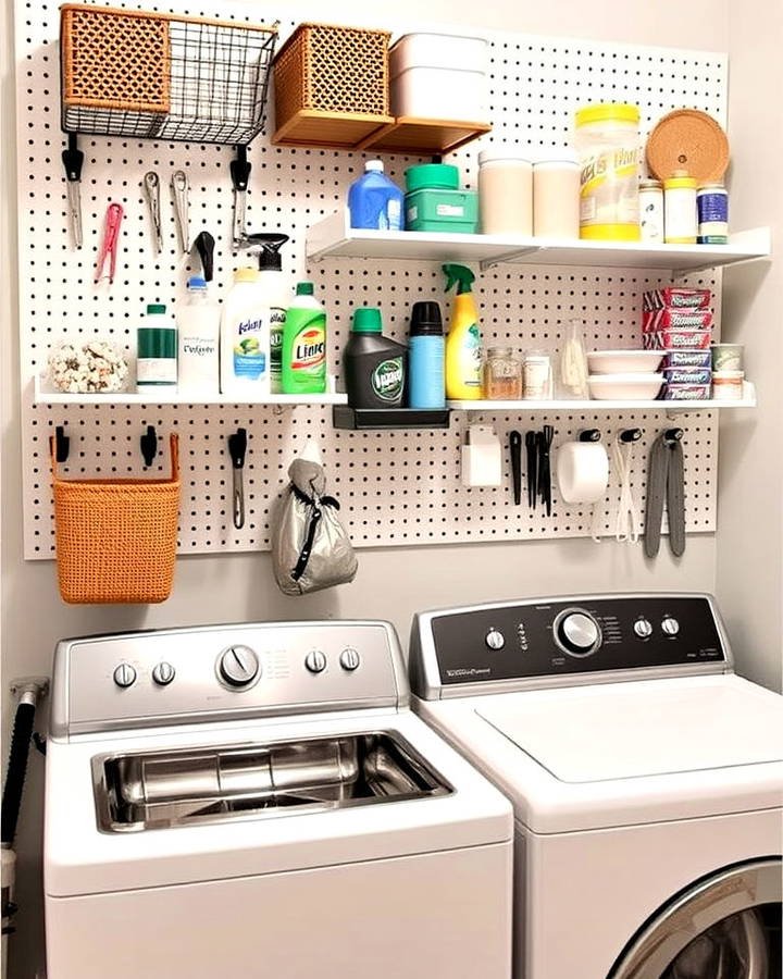 Keep your laundry space tidy with a pegboard system that organizes tools, brushes, and supplies in one spot. Pegboards make it easy to hang essentials within reach while saving shelf and counter space. Perfect for garages, laundry rooms, or small areas, this practical setup brings order and efficiency to your routine while keeping everything visible and accessible.