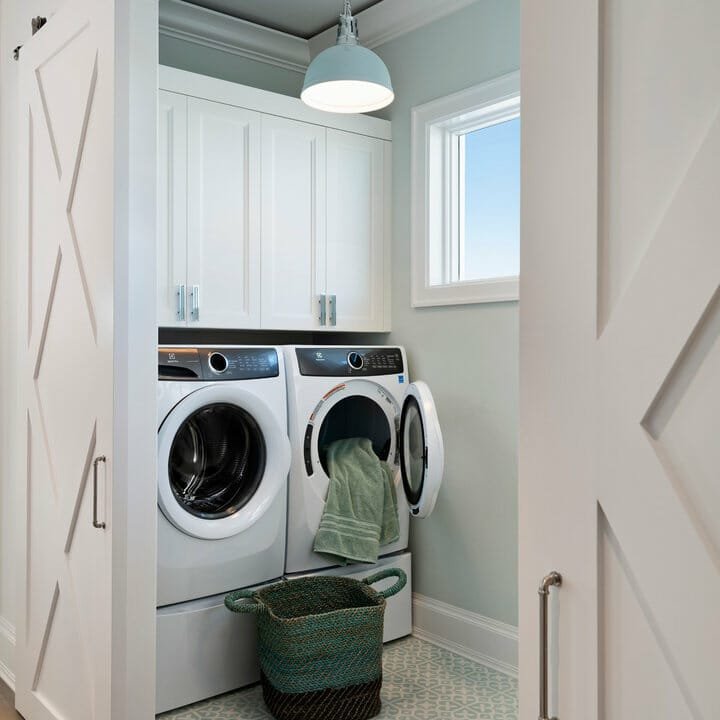 Hide your laundry area in style with a sliding barn door that blends charm with function. This space-saving idea works perfectly in garages, hallways, or multipurpose rooms, keeping washers and dryers tucked away while adding a design feature to your home. Easy to use and visually appealing, a barn door is a practical way to keep laundry zones organized and discreet.