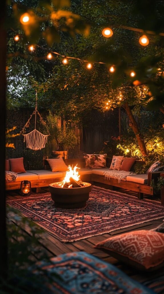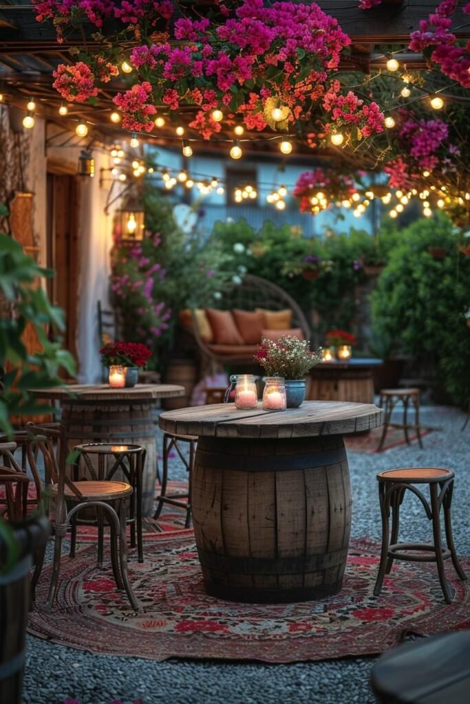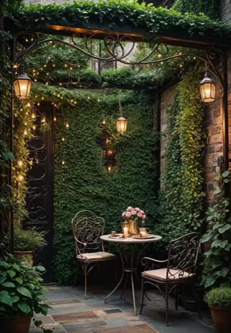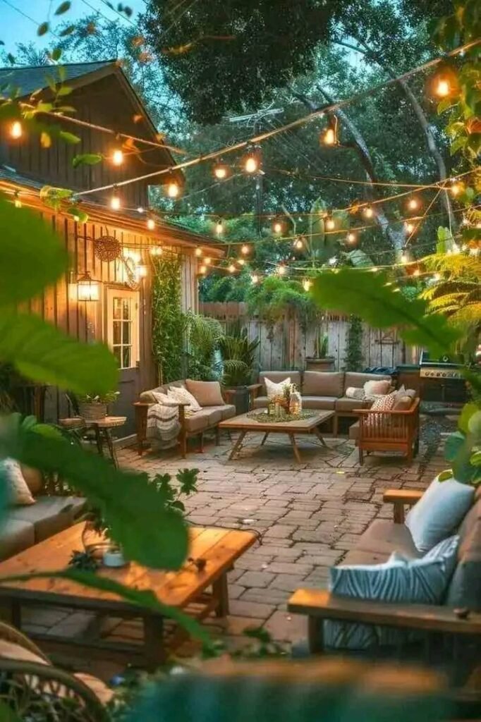 Create a magical backyard patio with warm lighting, lush greenery, and charming details that turn your outdoor space into a captivating retreat.