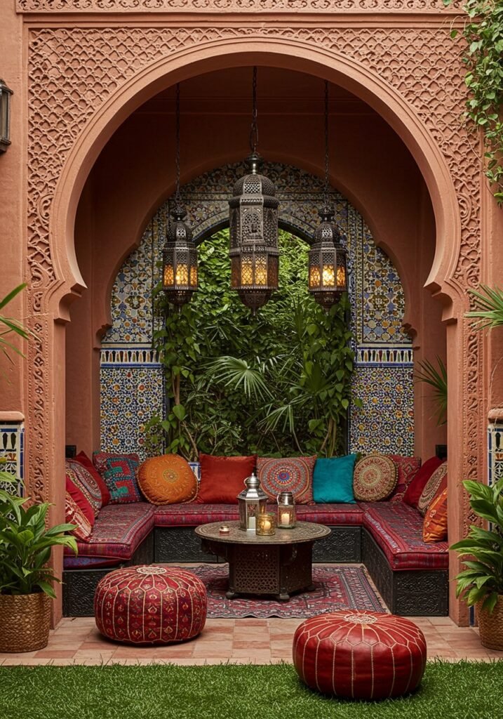 Create an exotic patio retreat with bold textures, lush plants, and rich patterns inspired by global styles. Mix vibrant tiles, layered fabrics, and warm lighting to form an inviting escape perfect for both lively gatherings and peaceful evenings.