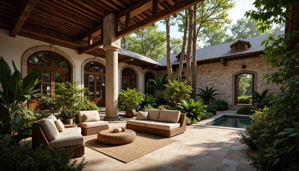 Visualize stepping onto a patio where every element carries a story. Weathered wood beams, reclaimed brick, and timeworn stone merge into a setting rich with character. Woven rugs soften the space, while wrought iron accents add a touch of old-world charm. Soft lighting, perhaps from lanterns or string bulbs, creates a gentle glow as evening settles in.