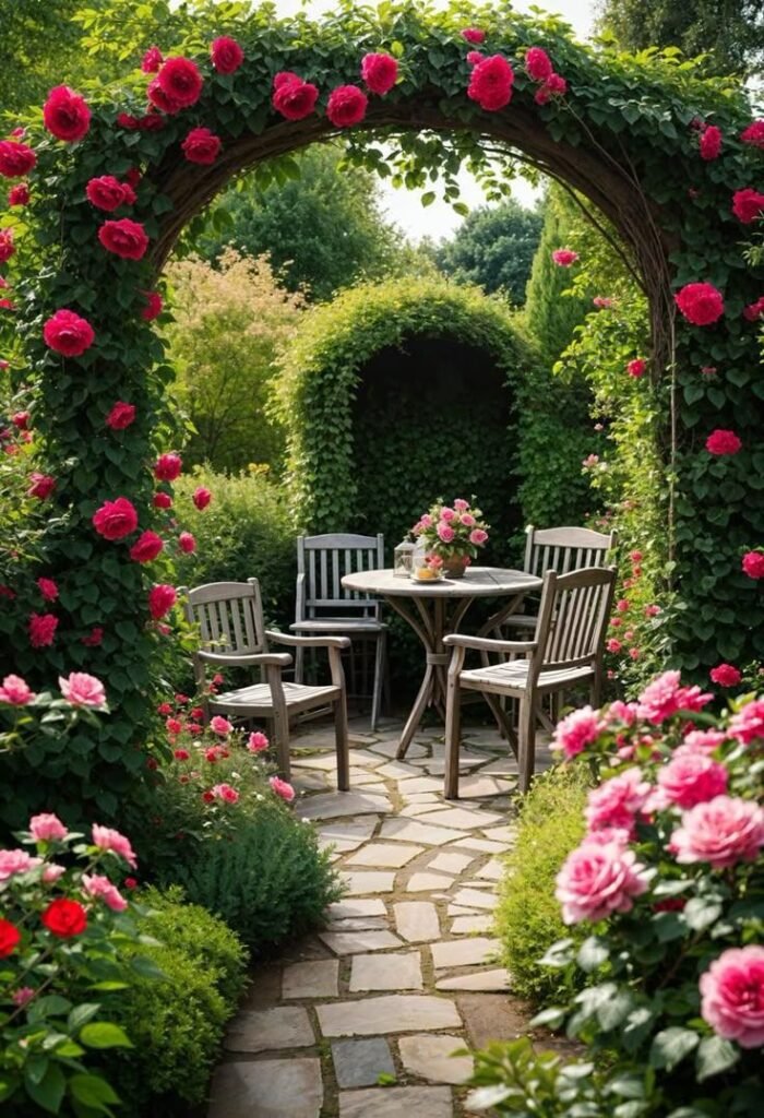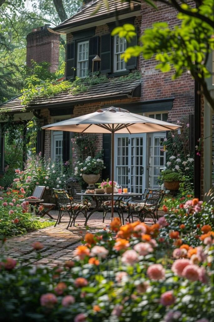 Create a classic English tea garden with fragrant blooms, wrought-iron seating, and winding stone paths. Pair pastel florals, climbing roses, and delicate table settings to craft an inviting space perfect for afternoon tea or quiet reading.