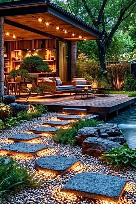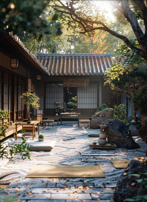 Create a serene patio inspired by Japanese design, featuring tatami mats, smooth stone pathways, and calming water accents. Pair low wooden seating with soft lighting and natural textures for a harmonious space ideal for rest and mindful gatherings.