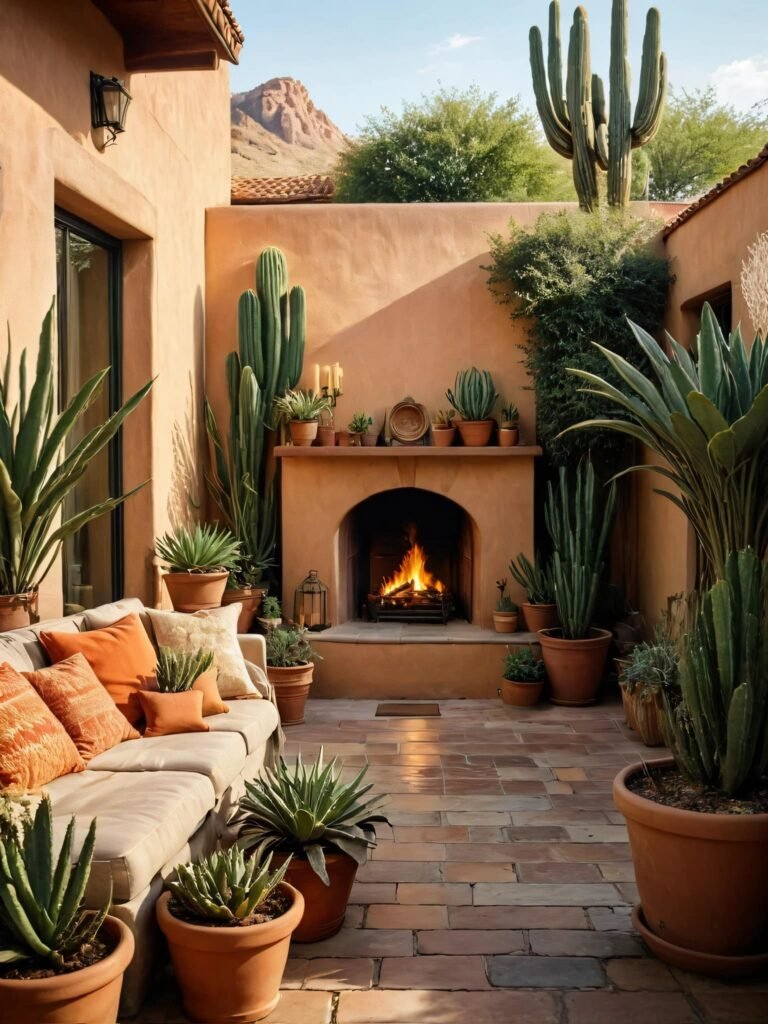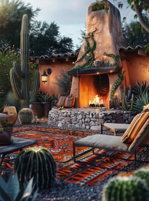 Bring desert charm to your outdoor space with earthy terracotta tones, rustic wooden beams, and patterned textiles. Add potted cacti, clay pottery, and warm lighting to create a welcoming retreat perfect for lively gatherings or peaceful sunsets.