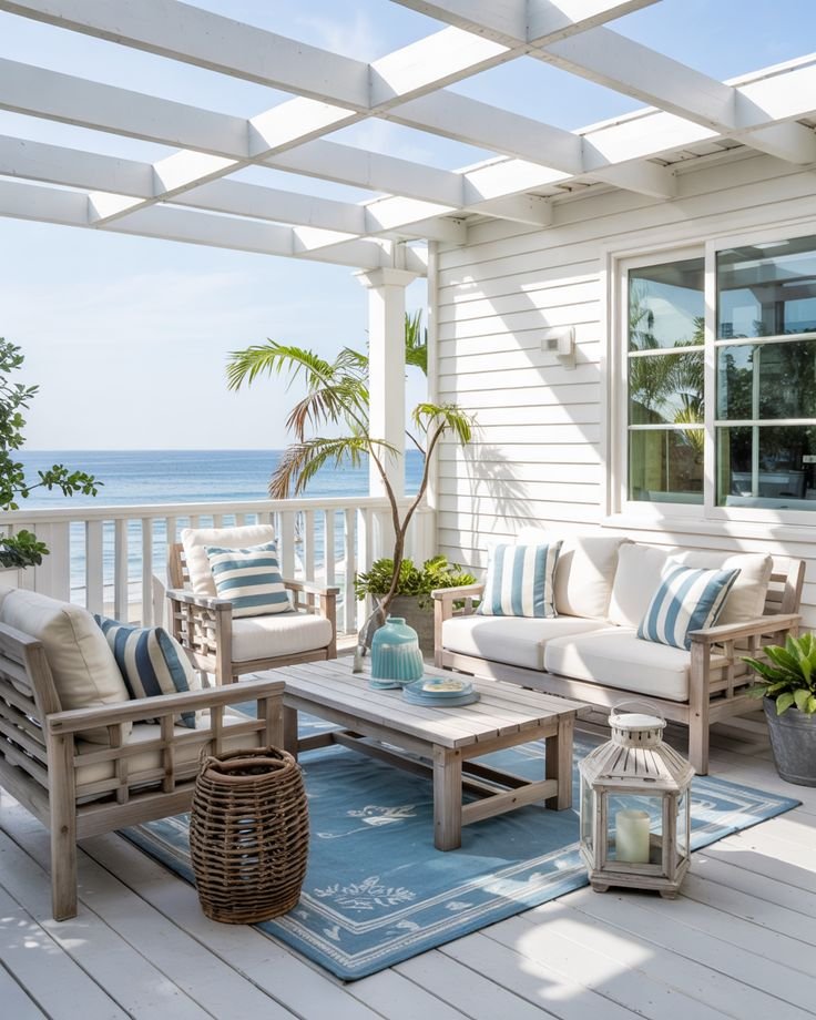 Bring coastal charm to your patio with airy colors, natural textures, and ocean-inspired details for a relaxed yet sophisticated outdoor retreat.