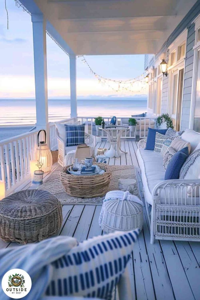Light fabrics sway in the breeze while muted blues, sandy neutrals, and crisp whites reflect the shoreline palette. This approach turns a patio into a space that echoes the charm of seaside living while remaining welcoming for gatherings or quiet afternoons.