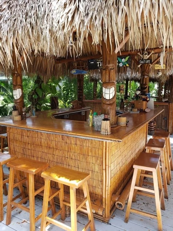 Use natural wood for the bar counter and stools. Decorate with seashells, coconut cups, and bright-colored glass bottles. A few tropical plants like ferns or banana trees around the area make the space feel lush and green.