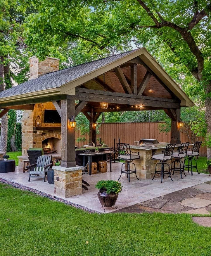 Include a grill, sink, and countertop for meal prep. Add a raised bar section with stools where guests can sit and chat. Use stone or granite for the surfaces—they are easy to clean and resist weather damage.