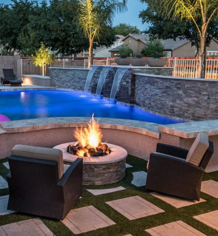 A fire pit adds warmth and atmosphere to your pool area. Combining it with a bar creates a social space that works both day and night.